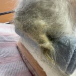 長い間ベットに横になっていた状態でシャンプーする事が出来ず、絡まってしまっていました。元々の髪の毛はボブくらいの長さだったそうですが、毛が細いこともあり後頭部は抜け毛が絡まり固まりになっていました。